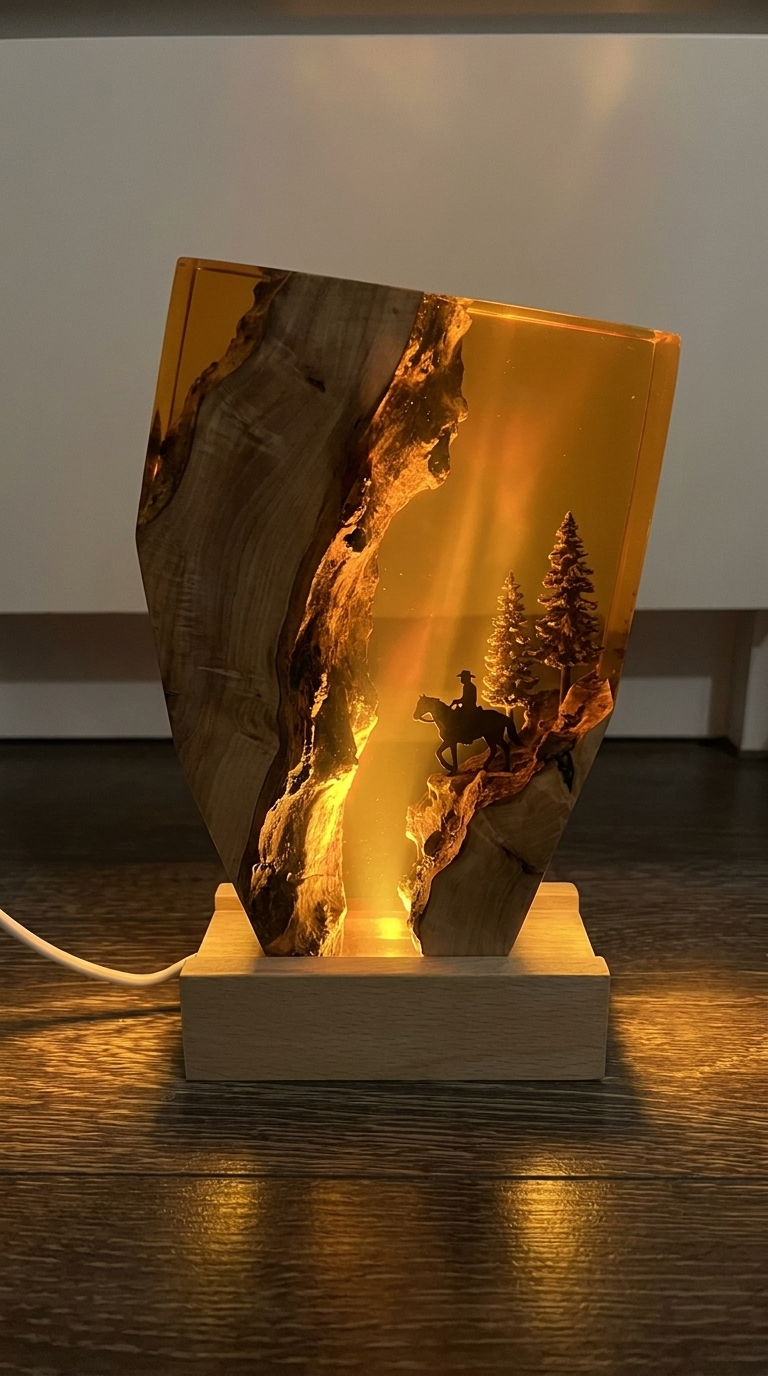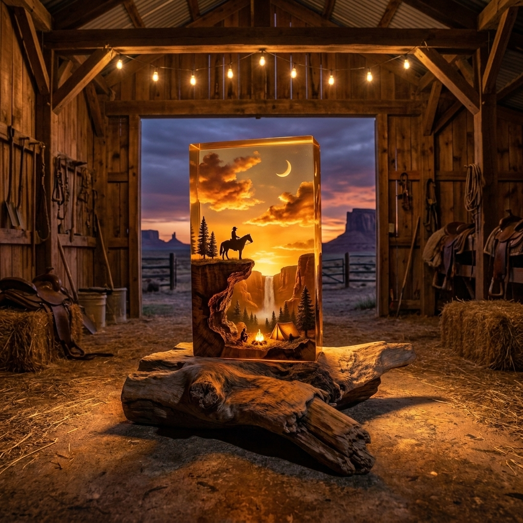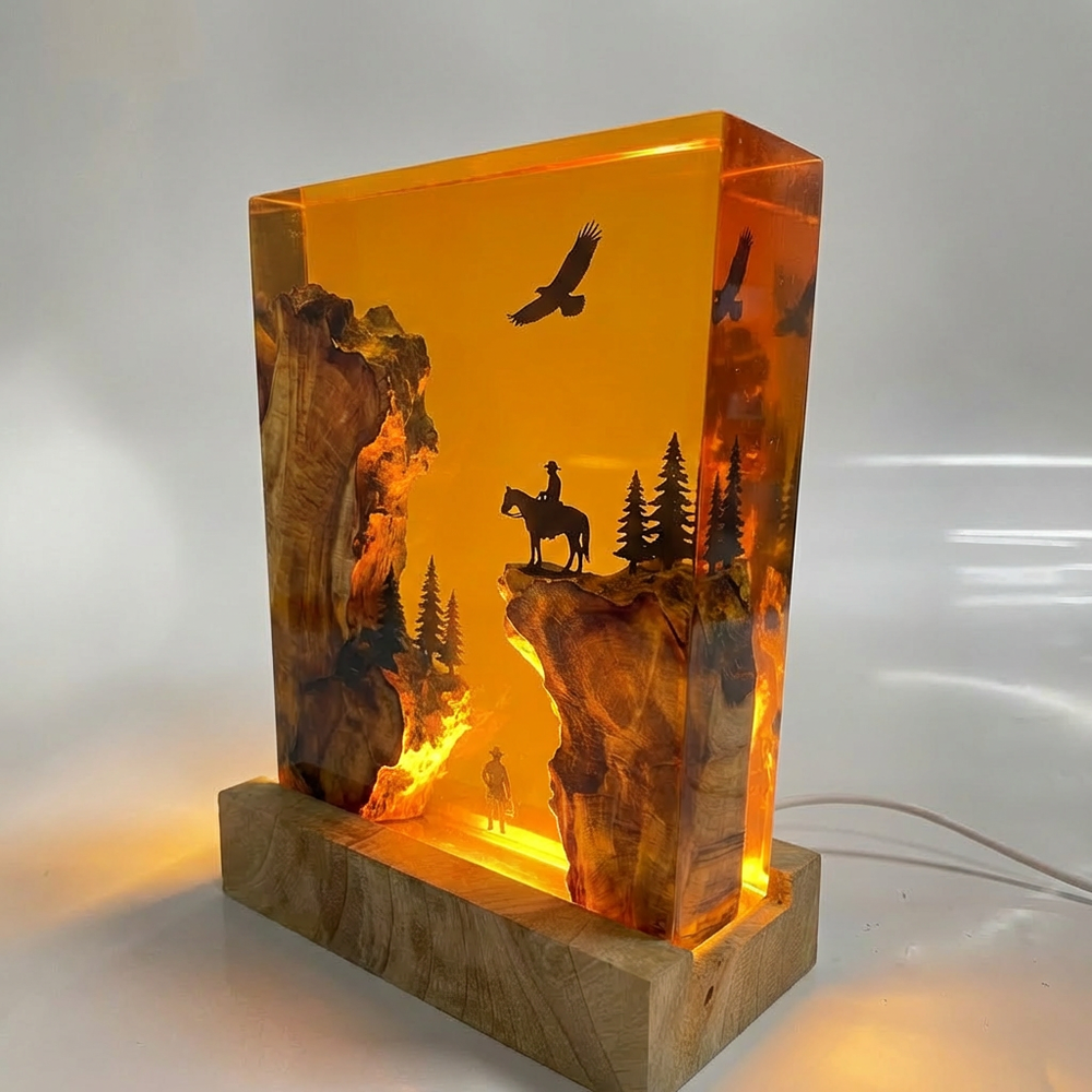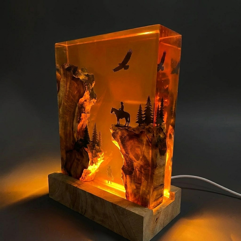 Each piece is a miniature frontier scene — dusty trails, warm amber tones, and rugged horizons captured inside crystal-clear resin with a built-in LED base. Turn the light on and the whole piece glows like a campfire at sundown. Small batch. No shortcuts. Made for the wild west at heart.