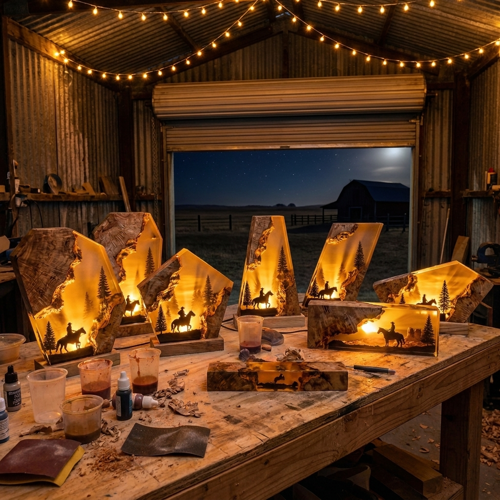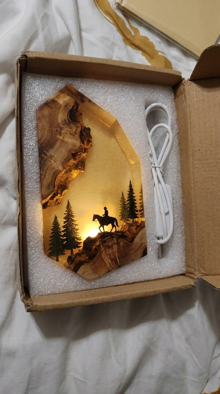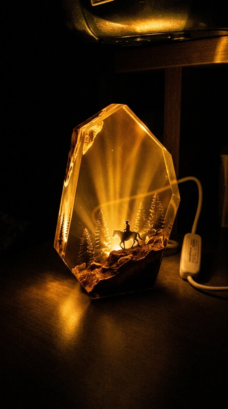 Each piece is a miniature frontier scene — dusty trails, warm amber tones, and rugged horizons captured inside crystal-clear resin with a built-in LED base. Turn the light on and the whole piece glows like a campfire at sundown. Small batch. No shortcuts. Made for the wild west at heart.