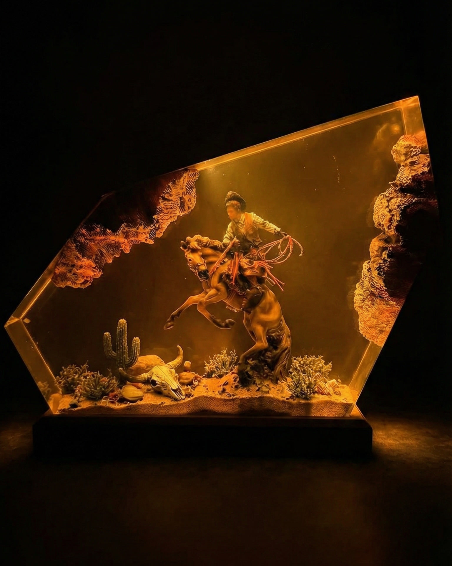 Designed to capture the spirit, grit, and glow of the Wild West, each lamp is handcrafted to feel like a real piece of the frontier. From rugged desert horizons to flickers of campfire light, every detail is carefully shaped and set in crystal-clear resin to create a piece that feels warm, rustic, and one of a kind — like it belongs right in a cowboy’s cabin after a long ride.